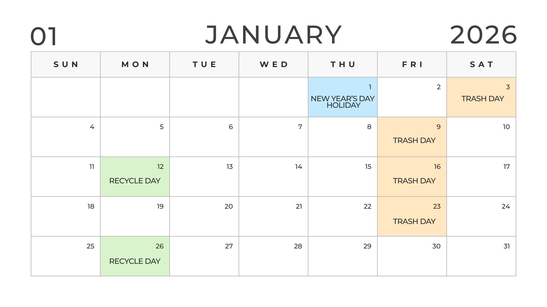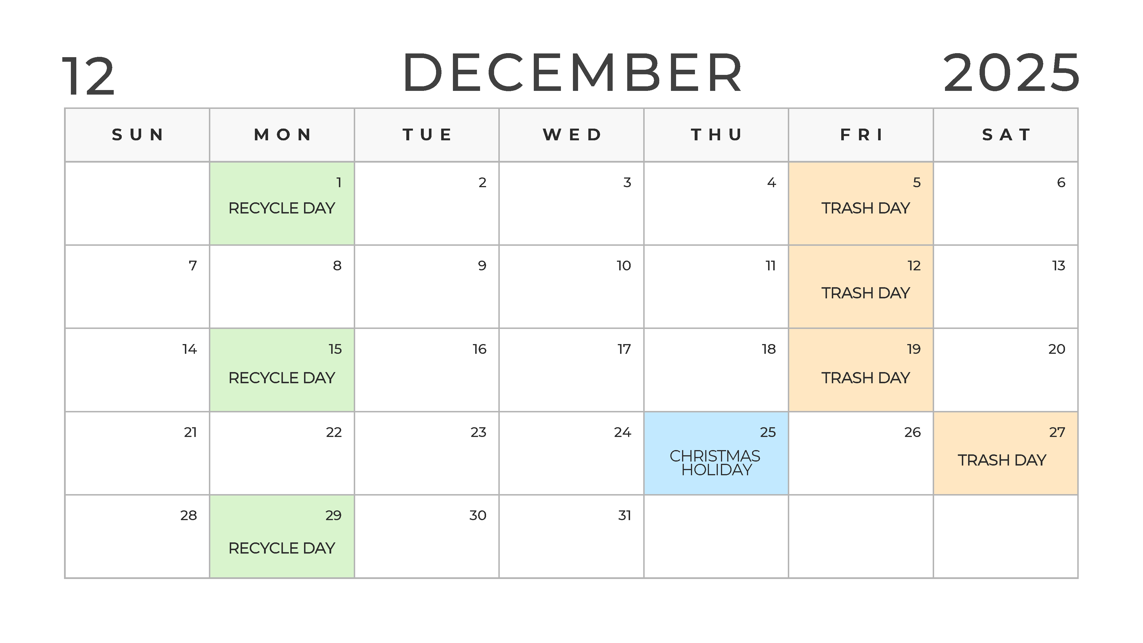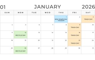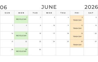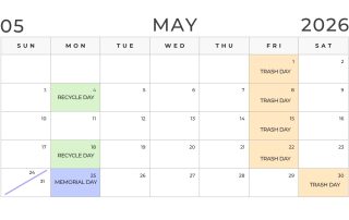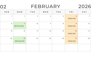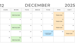 Trash Reminder: Trash will be picked up Saturday, December 27th and Saturday, January 2nd the next 2 weeks (as opposed to normal Friday pickup due to the holidays). Recycle will still be Monday, December 29th!