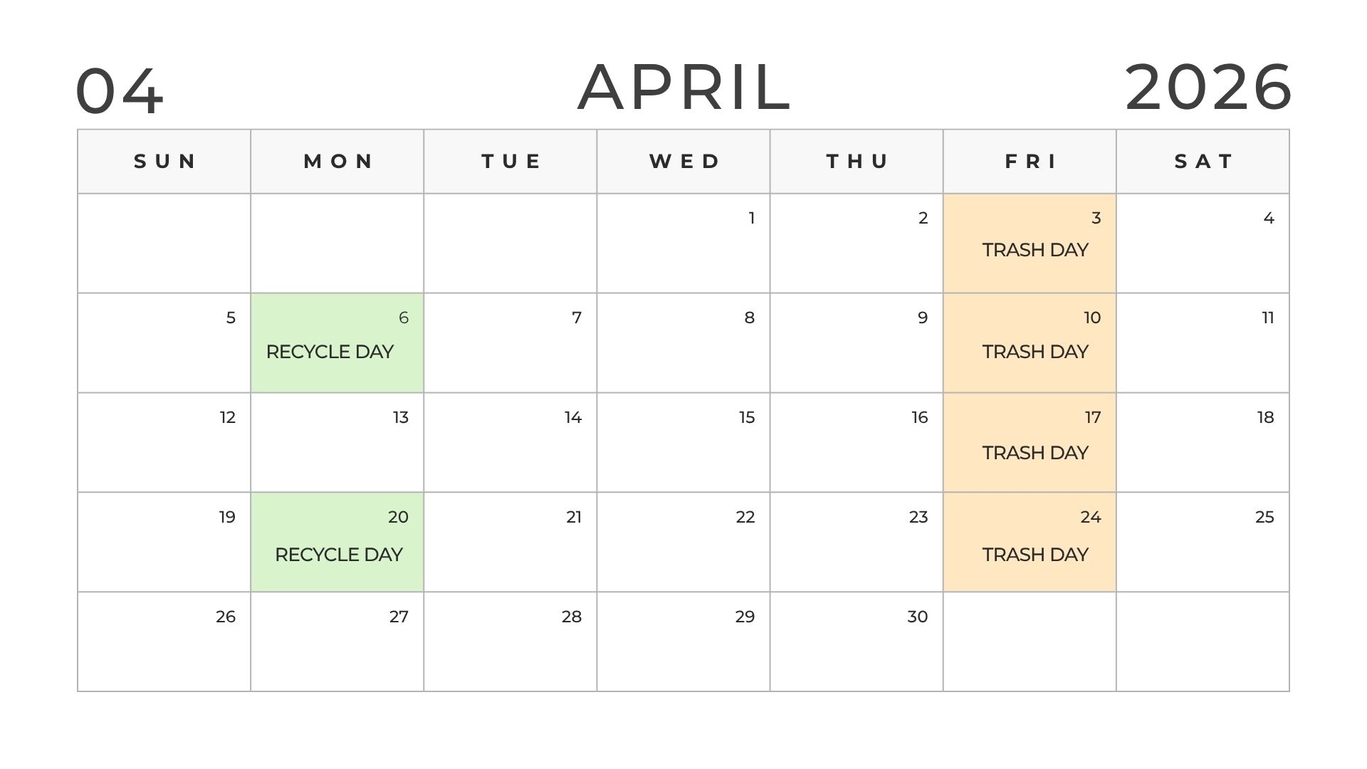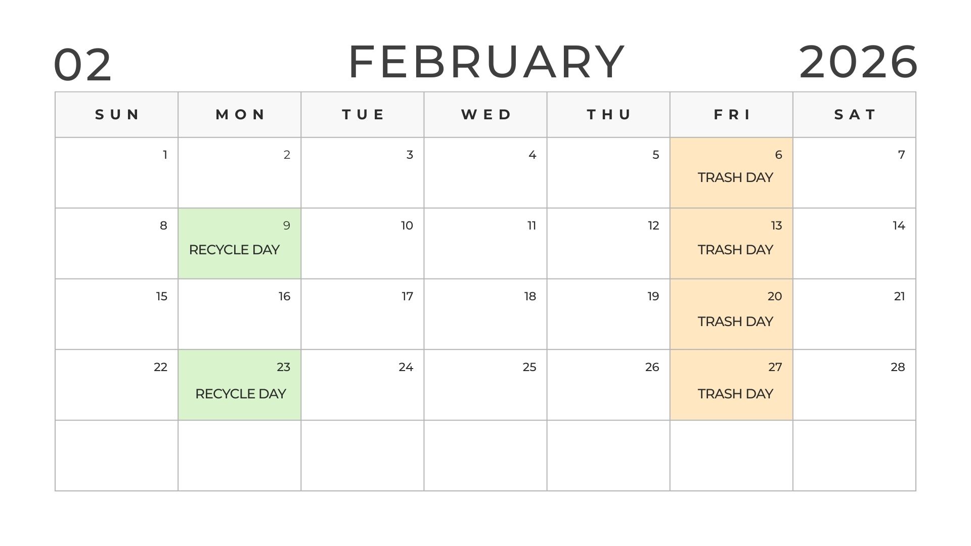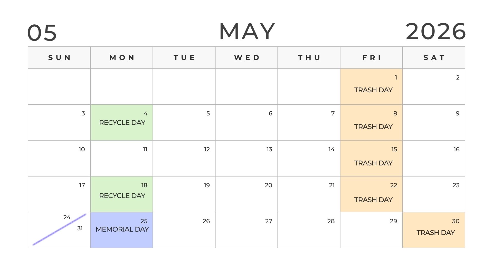 Trash Reminder: Trash will be picked up Saturday, December 27th and Saturday, January 2nd the next 2 weeks (as opposed to normal Friday pickup due to the holidays). Recycle will still be Monday, December 29th!